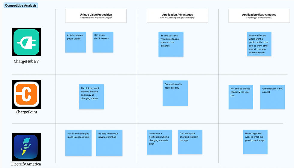 To better understand the market I completed a competitive analysis using FigJam on top mobile applications for electric vehicle charging stations.